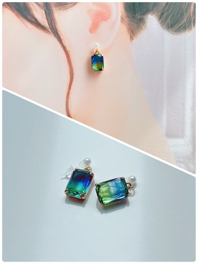 南国の海のような爽やかな青色と新緑のような緑色がきれいな、夏をイメージしたバイカラーの耳飾りです。
